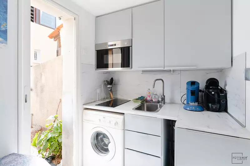 L'espace salon/cuisine est équipé d'un canapé-lit confortable (140x190), TV (chaines françaises), rangements, table avec 5 chaises pliantes, coin cuisine équipé (plaques de cuisson 2 feux induction, cafetière Senseo, grille-pain, bouilloire, micro-ondes, lave-vaisselle, lave-linge, réfrigérateur avec compartiment congélateur).