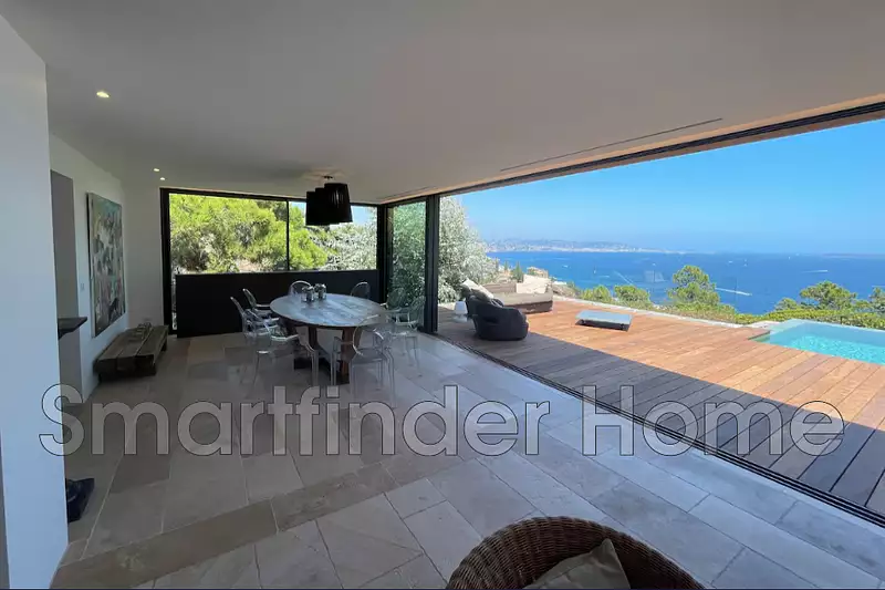 Superbe villa contemporaine, située en hauteur à Théoule-sur-Mer, offrant une vue panoramique sur la Baie de Cannes et les iles de Lerins et sans vis à vis.