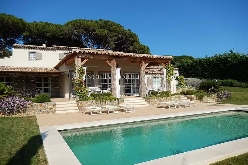 Belle villa située dans un quartier résidentiel à proximité immédiate du centre de Saint-Tropez et de la plage de Tahiti. La villa (d'une superficie de 340 m2 environ) est composée de cinq chambres climatisées avec quatre salles de douche et une salle de bains, d'un salon ouvert sur une terrasse couverte aménagée, d'une salle à manger, d'une cuisine très bien équipée donnant sur une seconde terrasse avec barbecue, d'une grande buanderie climatisée en sous-sol, de toilettes invités et d'un double garage.