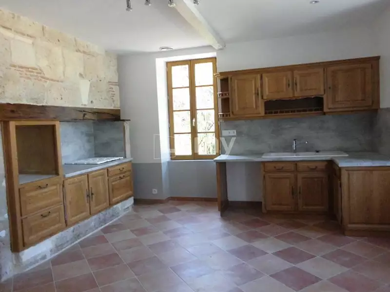 LA CROIX BLANCHE, à l'entrée du village, jolie maison en pierre de type3 , cuisine semi équipée et aménagée, séjour avec murs en pierre, une grande chambre avec placard intégré, une salle d'eau , wc séparé, un coin buanderie.Jardin semi clôturé d'environ 500m2. Très calme, pas de voisins.Beaucoup de charme!!