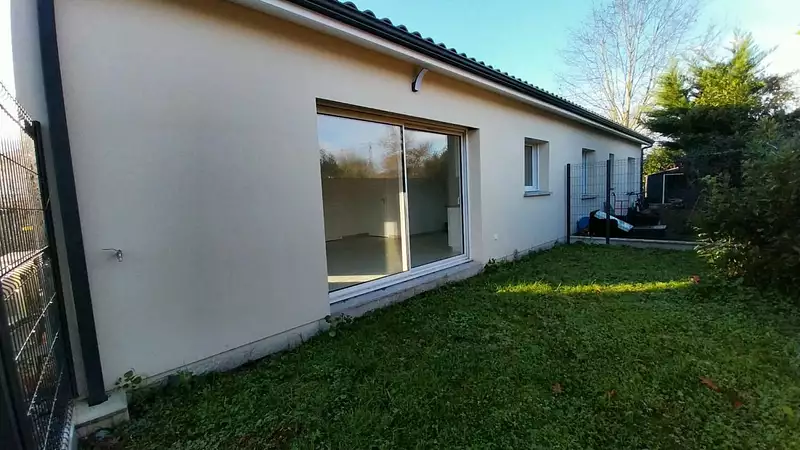 Maison neuve à louer dans le centre de SAUCATS, 63 m2 habitables avec jardin clos et places de parking. Elle se compose d'une pièce à vivre avec cuisine aménagée, cellier, deux chambres, salle d'eau. Chauffage climatisation réversible. Libre de suite.