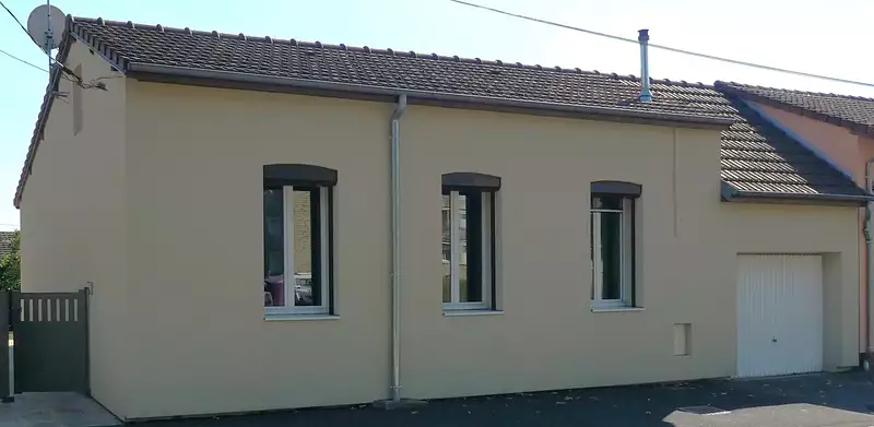 Le Creusot, Quartier des 4 chemins , coquette maison de plain-pied type grand T2 de 69m² avec isolation extérieure offrant : une entrée lumineuse (avec visiophone) desservant une cuisine équipée (lave-vaisselle 8 couverts, four, hotte, plaque induction, mange debout) avec chaudière gaz de ville, un séjour, une chambre avec placard mural , un petit couloir desservant la salle d'eau et un WC séparé. Le terrain plat exposé plein sud au total d'environ 300m² clos avec portail, avec terrasse et un garage attenant avec grenier au dessus. Double vitrage pvc avec volets solaires.