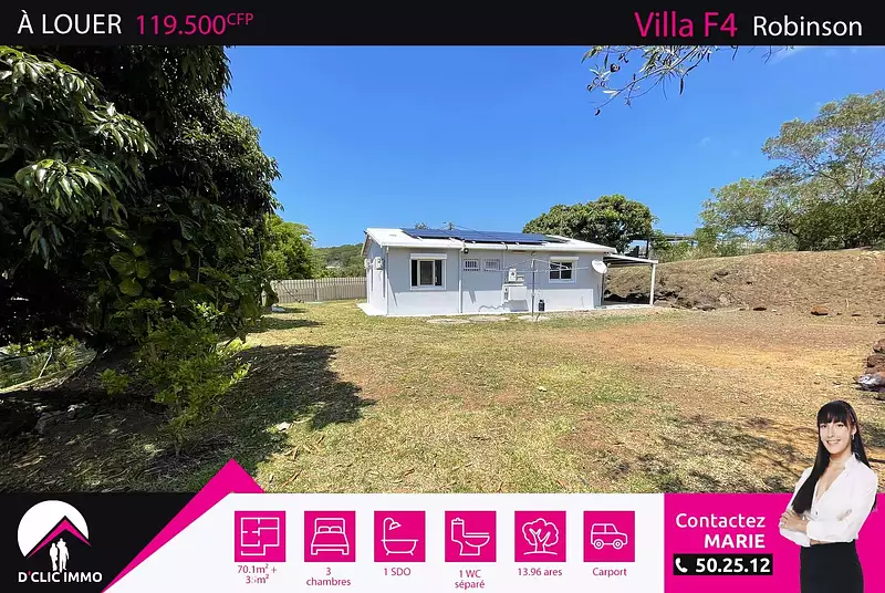 Idéalement située dans un quartier résidentiel très calme de Robinson, l'agence D'CLIC IMMO vous propose en exclusivité une spacieuse villa de type F4, de plain pieds, en construction traditionnelle d'une surface de 70.10m² habitable + 35m² de terrasses et carports sur un beau terrain plat de 13.96 ares clôturé entièrement.