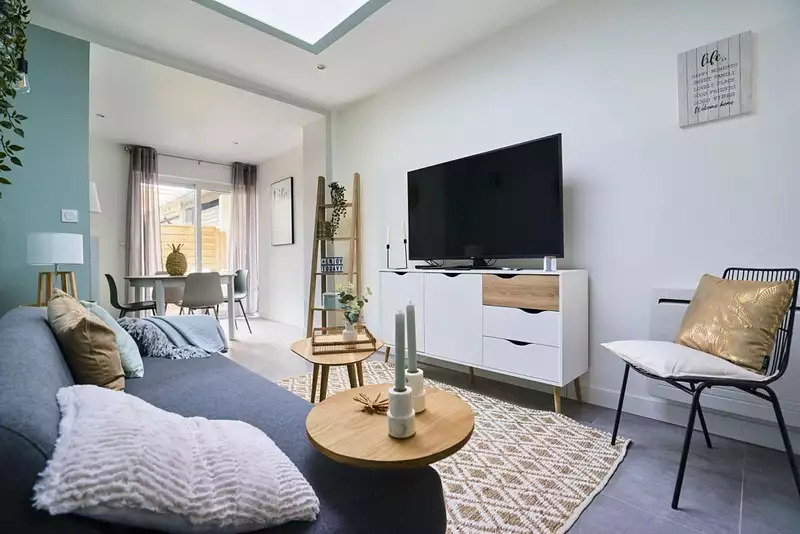 - Un salon/salle à manger avec TV / Wifi + une cuisine ouverte entièrement équipée (four, plaques, micro-onde, vaisselle, frigo, petit électroménager)
