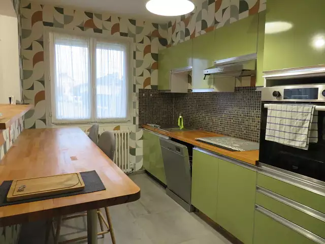 Maison mitoyenne avec au rez-de-chaussée : double séjour agréable avec accès jardin, cuisine ouverte aménagée et équipée (lave vaisselle, plaques de cuisson électriques, four, frigo, hotte). wc,
