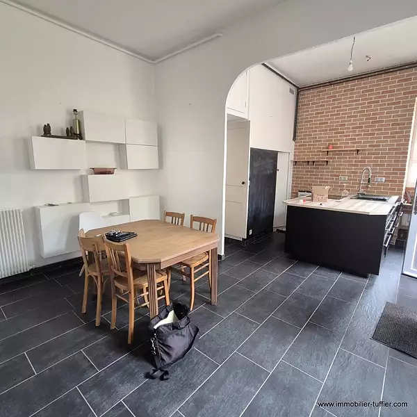 BAISSE DE PRIX pour cette jolie maison de bourg A LOUER rénovée et MEUBLÉE, comprenant : Au rdc une entrée, un salon, une cuisine aménagée équipée avec cave sous les parties.