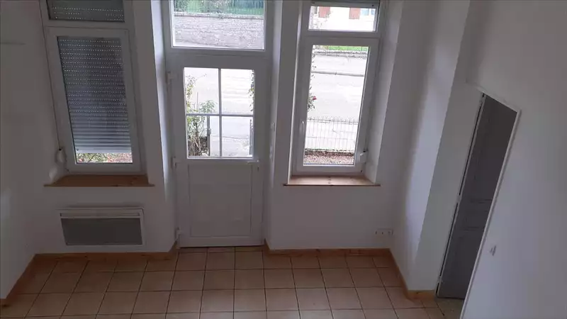 LIBRE début octobre : maison mitoyenne, comprenant : * Au rez-de-chaussée : salle, cuisine, salon, bureau, salle de bains avec WC, buanderie. * A l'étage : Palier, trois chambres.Cave. Garage en tôles