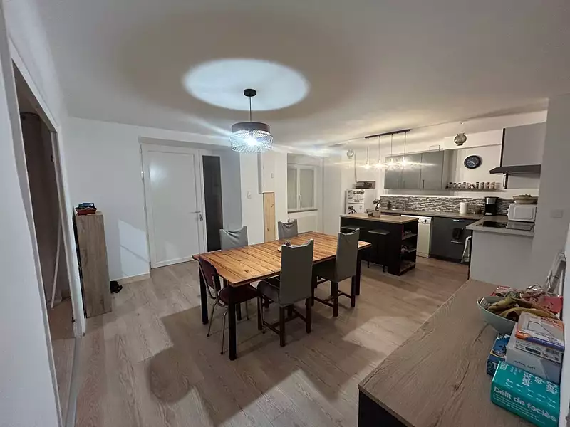 Proche commodités, maison à étage d'une surface habitable d'environ 93m² offrant une entrée sur une belle pièce de vie avec une cuisine aménagée et équipée avec son ilot central (hotte, plaques et four), un salon et un WC.
