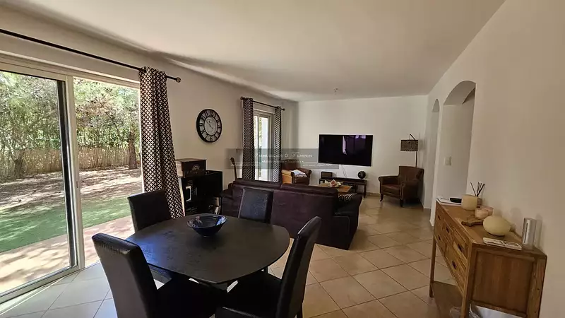 Cette dernière se compose d'une entrée donnant sur vaste séjour/salon avec climatisation réversible et accès de plein pieds à la terrasse et jardin avec gazon synthétique ; une cuisine semi ouverte aménagée, une chambre avec climatisation réversible et salle d'eau, des wc indépendants.
