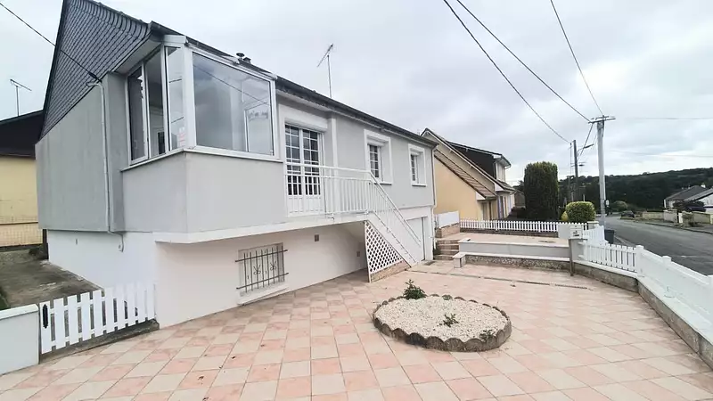 Maison comprenant une pièce de vie lumineuse, cuisine équipée, 3 chambres, 2 salles de bain et WC séparés.