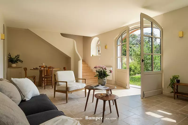 à l'étage, d'une grande chambre mansardée, d'une seconde chambre offrant une vue imprenable sur le jardin et le parc arboré, et d'une salle de bain avec WC.