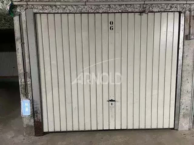 Box fermé en sous-sol d'environ 11m² avec porte basculante.