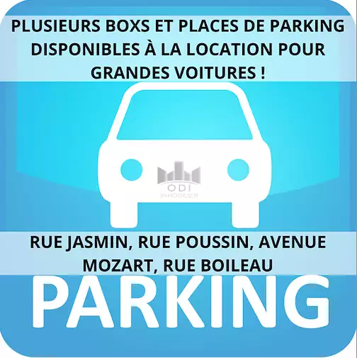 ODI IMMOBILIER vous propose à la location plusieurs emplacements de stationnements (box et place de parking).. Rue poussin, rue jasmin, avenue Mozart.