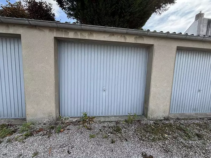 Garage de 16m² avec une porte à ouverture manuelle.