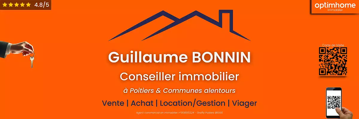 Je suis Guillaume BONNIN, conseiller immobilier indépendant chez Optimhome, spécialisé dans l’immobilier traditionnel et résidentiel (Vente | Achat), la location ainsi que la gestion locative et la vente en viager, 📍 à Poitiers (86000) et dans les communes environnantes.