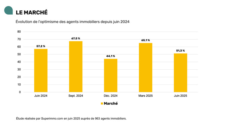 En juin 2025, 51,3 % des agents immobiliers se déclarent optimistes quant à l’évolution du marché au cours des six prochains mois. Ce niveau, en recul par rapport à mars (65,1 %), reste proche de celui enregistré un an plus tôt (52,3 %).
