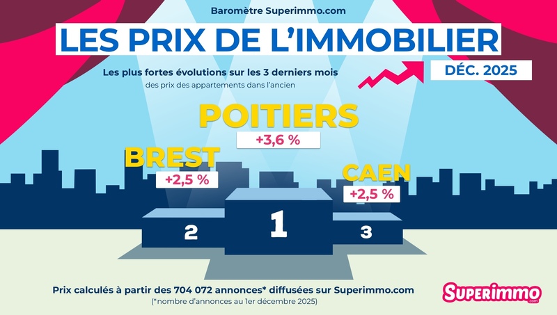 Méthodologie : Les prix du baromètre Superimmo.com présentés sont les prix médians des appartements affichés sur Superimmo.com, calculés sur la base des 704 072 annonces diffusées au 1er décembre 2025 sur Superimmo.com. Ils sont particulièrement intéressants car ils représentent la fourchette haute des prix. En effet ces prix sont le reflet des prix attendus par les vendeurs avant une éventuelle négociation et ils incluent la commission agence.