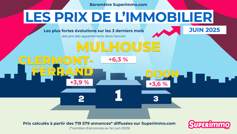 Méthodologie : Les prix du baromètre Superimmo.com présentés sont les prix médians des appartements affichés sur Superimmo.com, calculés sur la base des 719 579 annonces diffusées au 1er juin 2025 sur Superimmo.com. Ils sont particulièrement intéressants car ils représentent la fourchette haute des prix. En effet ces prix sont le reflet des prix attendus par les vendeurs avant une éventuelle négociation et ils incluent la commission agence.